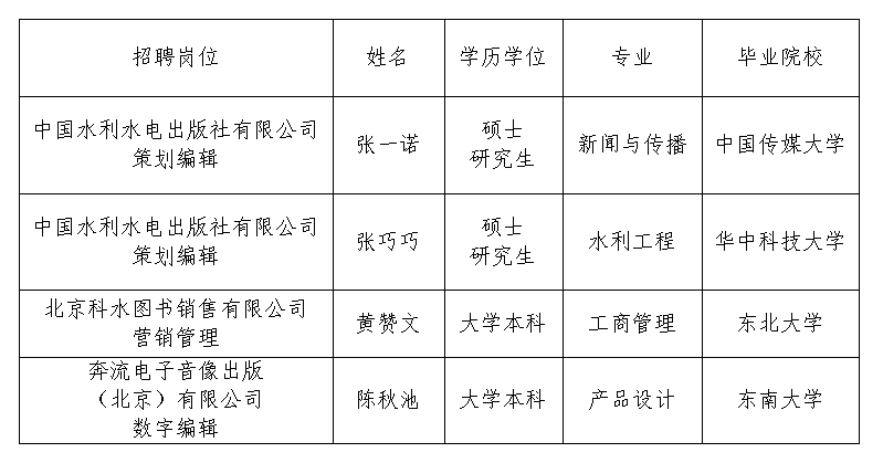 水電知識網(wǎng)»資訊»通知公告»中國水利水電出版?zhèn)髅郊瘓F有限公司2026年度公開招聘擬聘人員公示